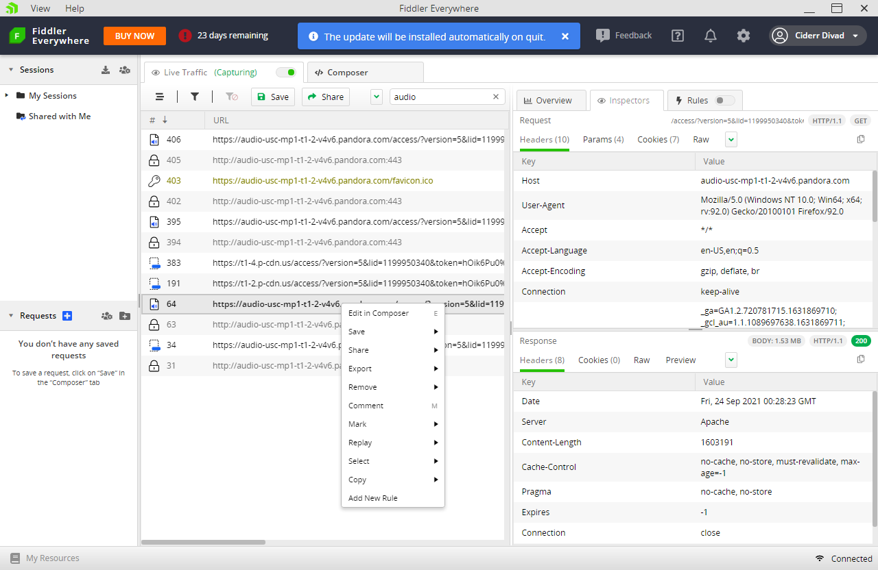 Within Fiddler Everywhere, you will see every request URL your web browser sends. From the search box, you can type “audio” to find the download link to the Pandora song that you are listening. You just copy the URL to your downloader program or your web browser to download it.