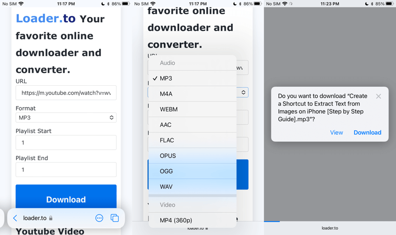 This web app is quite easy to use. All you need to do is paste the YouTube URL and click the Download Button. By default, the format is set to MP3, you can change it to MP4. If you input a YouTube playlist URL, you can also specify the start index and end index to download some videos in the playlist in go one. You can download 10 videos at most in the playlist at once.
